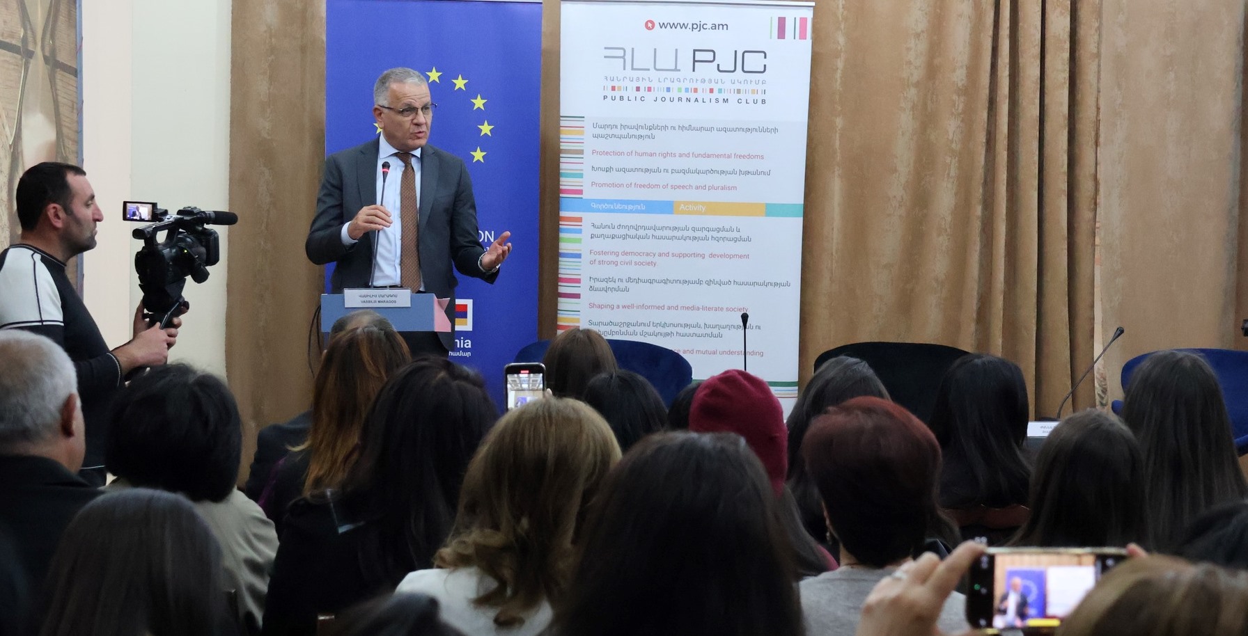 Քննարկմանը մասնակցում էին Հայաստանում ԵՄ պատվիրակության ղեկավար, դեսպան Ն. Գ. Վասիլիս Մարագոսը, ՀՀ Գեղարքունիքի մարզպետ Կարեն Սարգսյանը, ինչպես նաև լրագրողներ, մեդիա մասնագետներ, քաղաքացիական հասարակության ներկայացուցիչներ։ Քննարկմանը մասնակցեցին ԳՊՀ ուսանողներ և դասախոսներ՝ Կառավարման և ֆինանսների ամբիոնի վարիչ Սամվել Ամիրխանյանը, Հաշվապահական հաշվառման ամբիոնի վարիչ Հակոբ Ղուլոյանը, բնագիտատնտեսագիտական ֆակուլտետի դեկանի տեղակալ Մելանյա Գարեյանը, բուհի արտաքին կապերի և լրատվության բաժնի վարիչ Լիլիթ Թոռչյանը, նույն բաժնի մասնագետ Նունե Միրիբյանը, հասարակական գիտությունների ամբիոնի դասախոս Ջուլիետա Մարգարյանը, ուսումնական խորհրդատու Արմինե Ղաջոյանը, Կառավարման և ֆինանսների ամբիոնի դասախոս Սոնա Բագոյանը, ինչպես նաև բնագիտատնտեսագիտական և հումանիտար մասնագիտությունների ֆակուլտետների ուսանողներ։