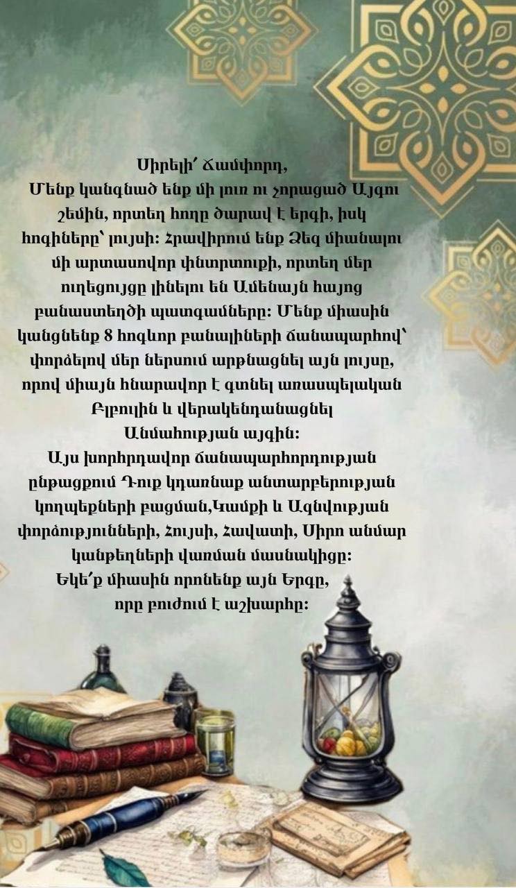 Սիրելի՛ համալսարանականներ, դպրոցների ուսուցիչներ և աշակերտներ, հարգելի՛ բարեկամներ, հրավիրում ենք գեղեցիկ ու հետաքրքիր ճամփորդության, որի մասնակիցը կարող եք դառնալ՝ ներկա գտնվելով «Թումանյանական պատգամների լույսն ու խորհուրդը Հազարան բլբուլի որոնումներում» թեմայով նախագծային աշխատանքի ներկայացմանը, որը տեղի կունենա ս․ թ․ մարտի 18-ին, ժամը՝ 13։00-ին, Գավառի պետական համալսարանի կենտրոնական մասնաշենքի Հրաչյա Աճառյանի անվան լսարանում: