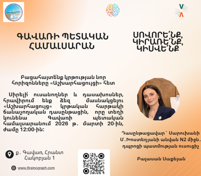 Բաց դասը կանցկացվի ս․ թ․ մարտի 20-ին՝ ժամը 12:00-ին, Գավառի պետական համալսարանի կենտրոնական մասնաշենքի Հրաչյա Աճառյանի անվան լսարանում: